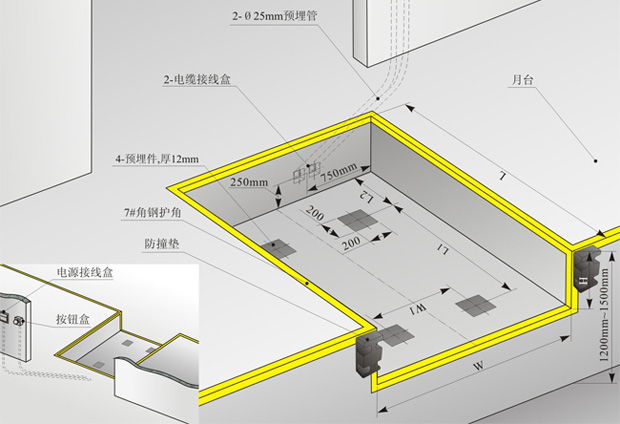 1、兩根預(yù)埋管分別走動力電源線及控制電源線,管徑大于25毫米,走向視電源接線位置及按鈕安裝位置。